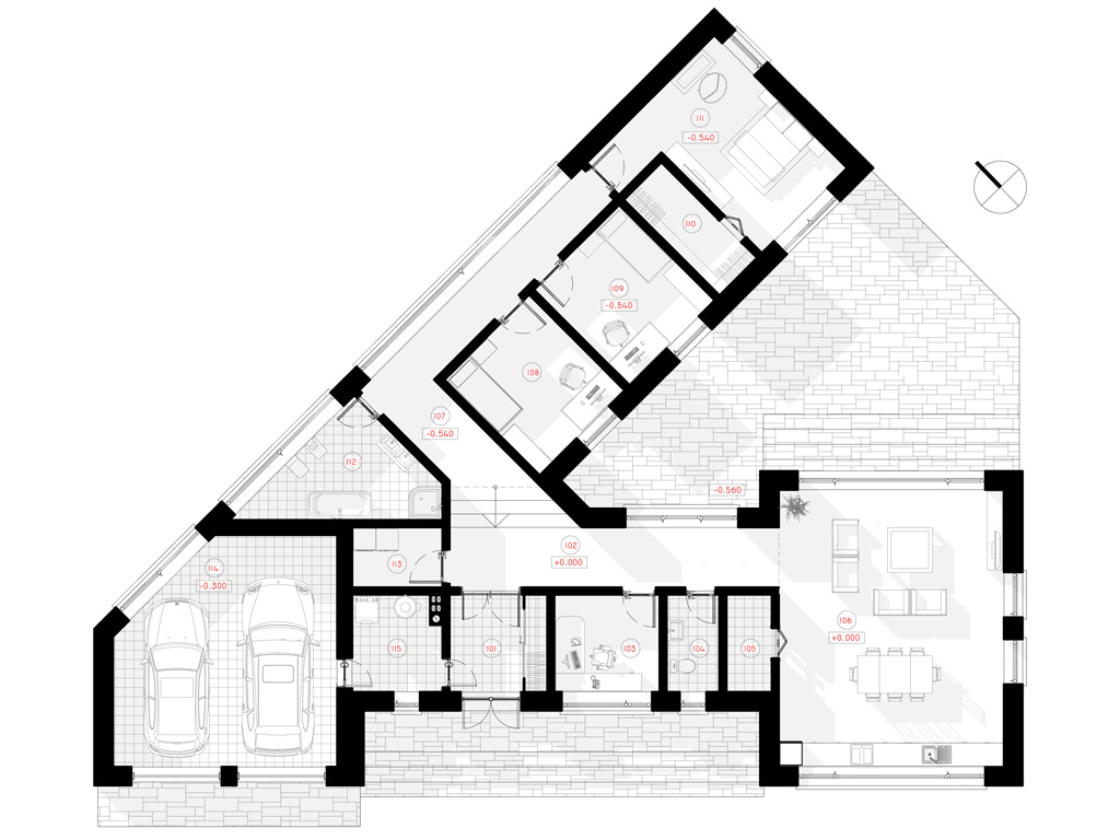 Netradiciniai sprendimai - puiki išeitis. Būtent šis pasakymas šauniai apibūdina Huberto namo projektą. Namo projektas orientuotas pagal pasaulio šalis, sumodeliuotas jaukus, įtraukiantis vidinis kiemas, kuris suburs visą šeimą drauge paleisti laisvalaikį. Negana to, namas trijų tūrių: aukštesnioji dalis dalis priklauso gyvenamajai zonai - svetainei, valgomajam, virtuvei; vidurinioji dalis - pagalbinėms patalpoms; žemiausioji dalis, kuri žemesnė ne tik stogo atžvilgiu, bet ir įgilinta į reljefą, todėl pastato viduje suprojektuotos kelios pakopos - poilsio zonai. Visos zonos funkciškai atskirtos, kad viena kitai netrukdytų. Jei ieškote išskirtinio, modernaus, apgalvoto, funkciškai išspręsto namo, net ir netradiciniame sklype su perkritimu - Hubertas - Jūsų svajonių namas.